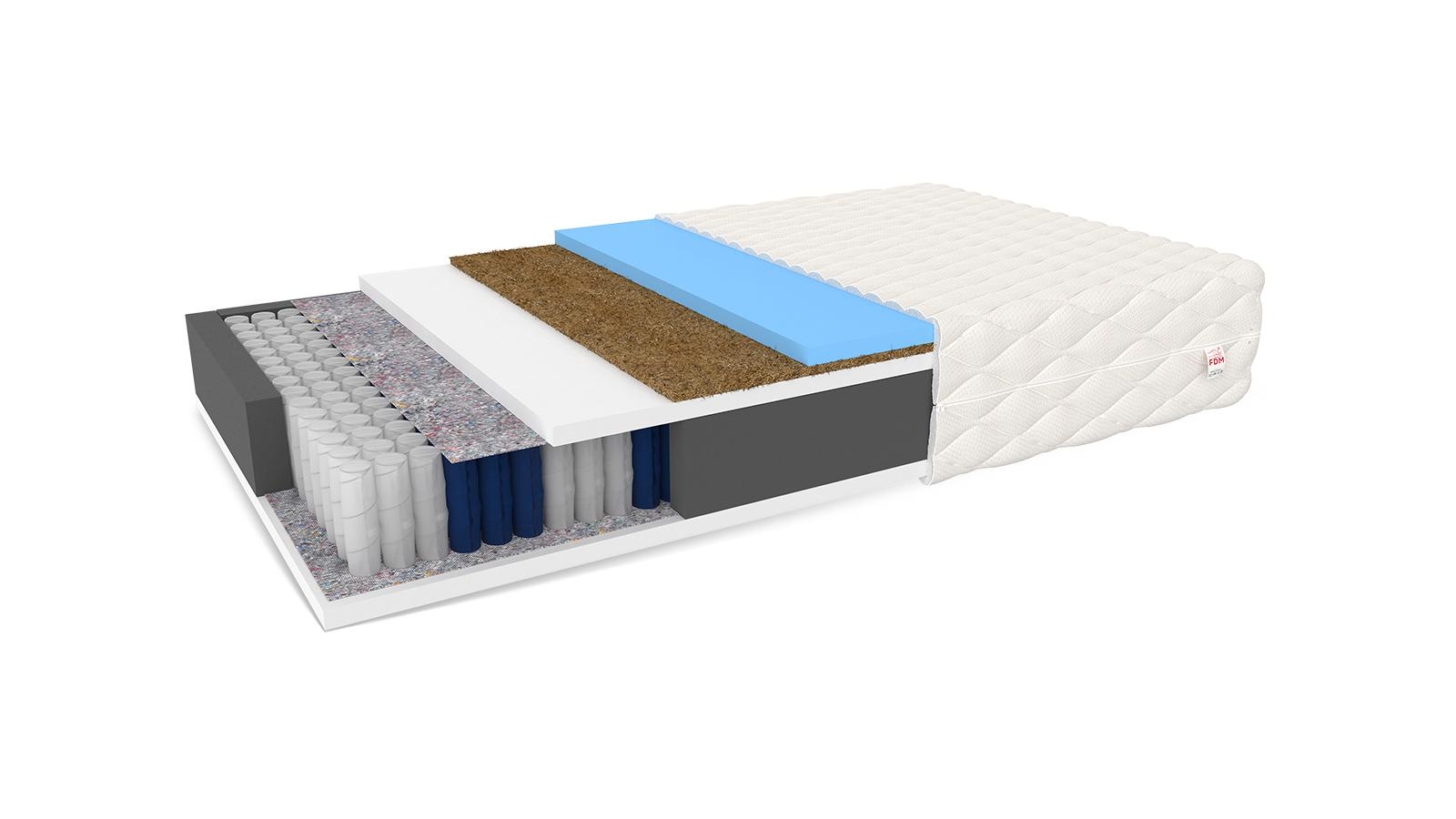 Bazę materaca MODENA MAX stanowi formatka pocketowa (kieszonkowa). Sprężyny dzielą materac na 7 stref, każda o odpowiednim podparciu dla danej części ciała. W ich sercu drzemie podwójnie hartowany drut. Wykonany w technologii NanoHARD znacznie przedłuża ich żywotność. Sprężyny kieszeniowe zostały otoczone pianką poliuretanową o podwyższonej twardości.W tym modelu został zastosowany wkład kokosowy, który został pokryty warstwą wysokoelastycznej pianki HR. Stanowi ona miękkie i niezwykle elastyczne wypełnienie, zachowując przy tym zdrowotne walory włókien kokosu. Pianka ta posiada gęstość o wiele większą niż tradycyjne pianki poliuretanowe. Dwa razy szybciej odzyskuje swój pierwotny kształt. Oznacza to, że lepiej reaguje na każdą zmianę pozycji ciała.Specyfikacja: twardość: H2 średnio miękki; H3 średnio twardy, grubość: 28 cm.Skład: Powierzchnia użytkowa: Dwustronne , Wkład kokosowy: 1 cm, Pianka HR: 4 cm, Pianka poliuretanowa T25: 2 cm, Pokrowiec: 1 cm, Wysokość sprężyn: 18 cm, Pianka Poliuretanowa T25: 2 cm.